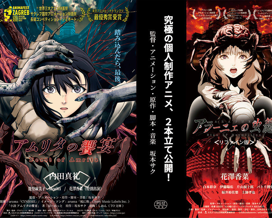 2023 / 05 / 26 ( Fri ) 坂本サク監督が音響以外を一人で製作した長編ホラーアニメーション映画『アラーニェの虫籠』から四年、待望の新作にして『アラーニェ』の前日譚というか姉妹編『アムリタの饗宴』が公開です。